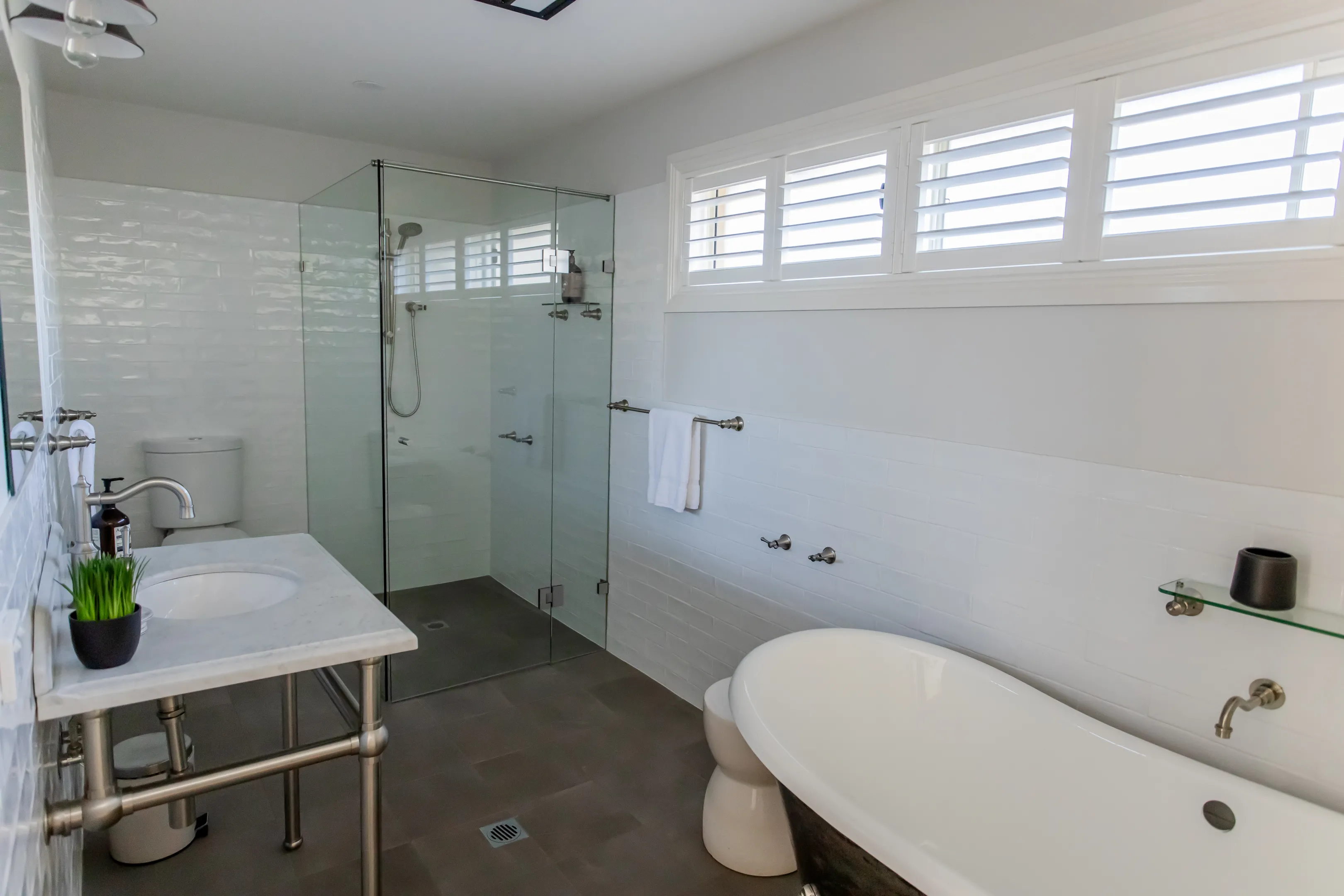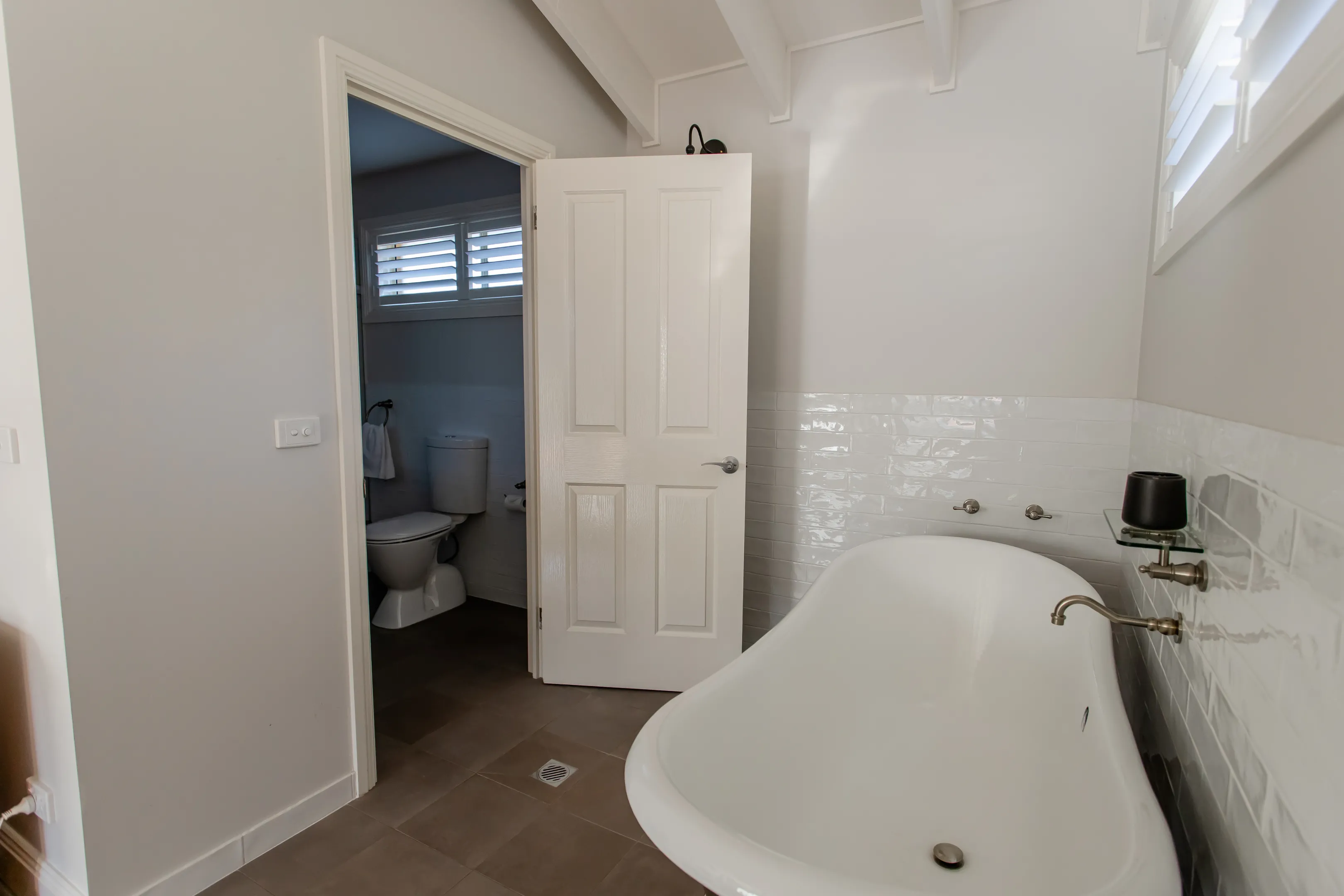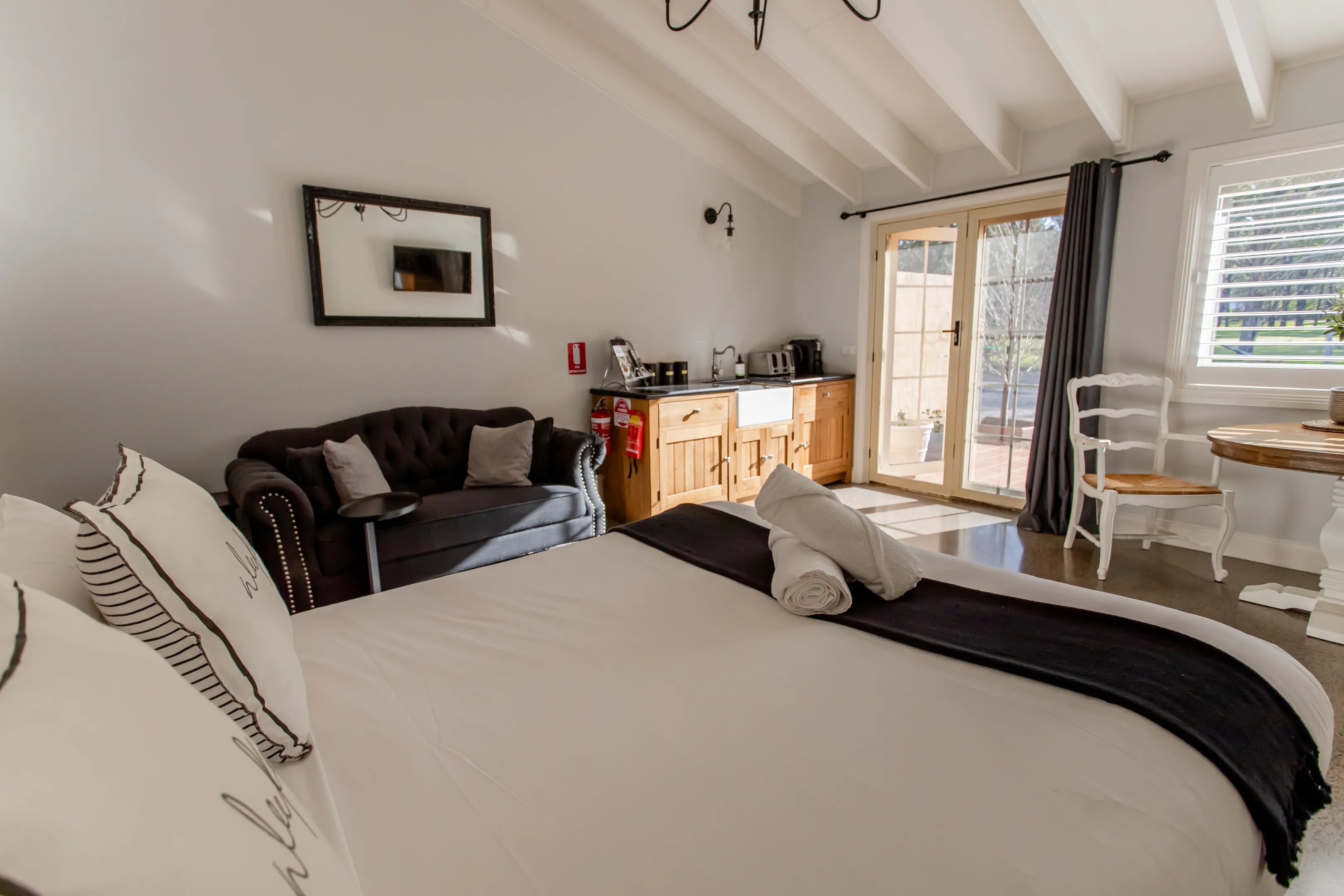 Offering an open plan living area with lounge, queen sized bed, dining area and kitchenette, bathrooms including separate showers and a classic cast iron claw foot bath.